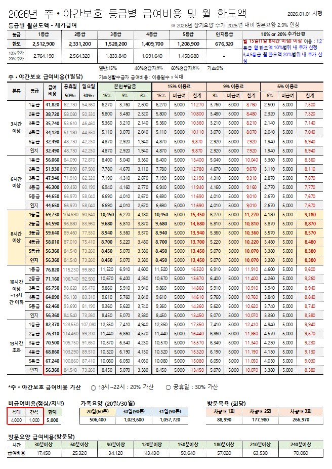 • 총이용비용 = (등급에 따른 본인부담금 + 비급여항목(식대+간식비)) * 이용일수
