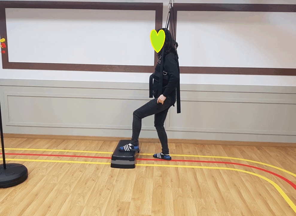 보행이 어려운 어르신이라도 재활 기구를 착용해 계단오르기를 할 수 있습니다.